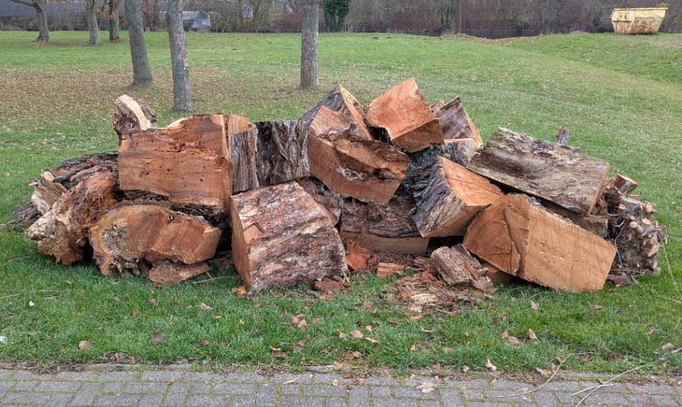 Am 05.11.2025 haben Mitglieder aus dem Jenaer Anglerverein e.V. zusammen mit Angelfreunden aus dem Verband der Sportfischer Lobeda e. V. im Rahmen eines Arbeitseinsatzes den Baum gefällt. Nun liegen die Teile auf der Wiese neben dem Anglerheim und müssen noch entsorgt werden. Braucht vielleicht jemand das Brennholz?